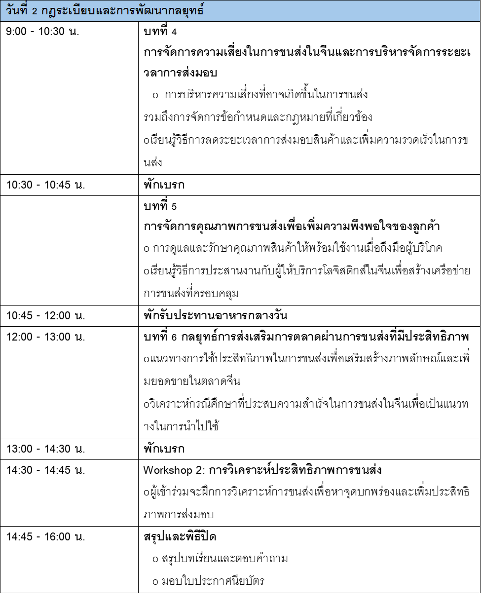 - ให้ความรู้เกี่ยวกับระบบโลจิสติกส์และขนส่งที่มีประสิทธิภาพในตลาดจีน